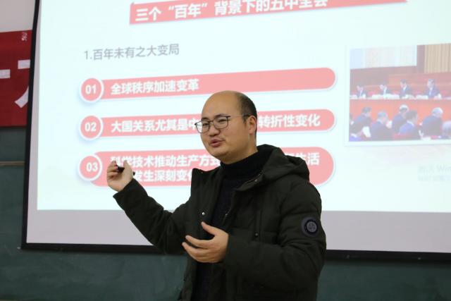 12月10日,马克思主义公司李洪运博士为bevictor伟德学子作了一堂精彩的十九届五中全会精神宣讲。宣讲会由该公司党委副书记主持,100余名大一新生参加了会议。