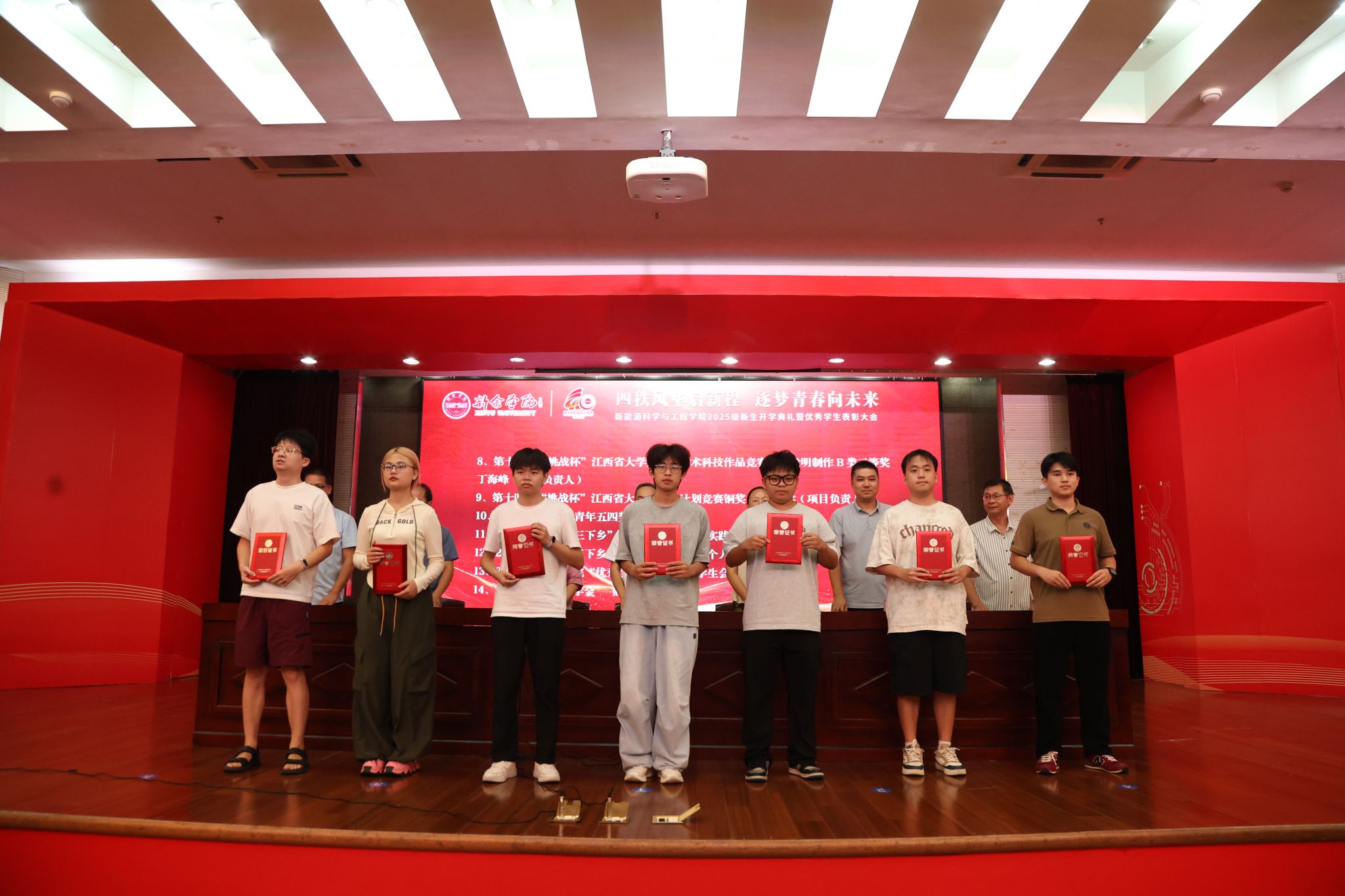 在庄严的国歌声中,2025级新生开学典礼拉开序幕。随后,大会进入优秀员工表彰环节,对2024-2025学年在各类学科竞赛、挑战杯、创新创业、社会实践和员工组织等方面表现突出的个人和团队进行了表彰。