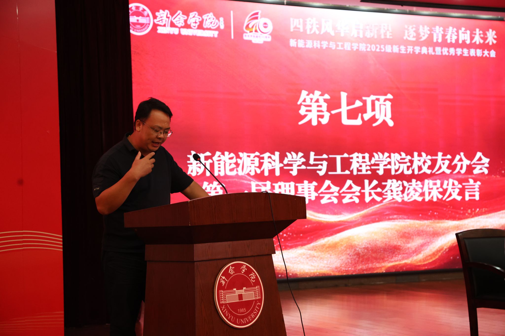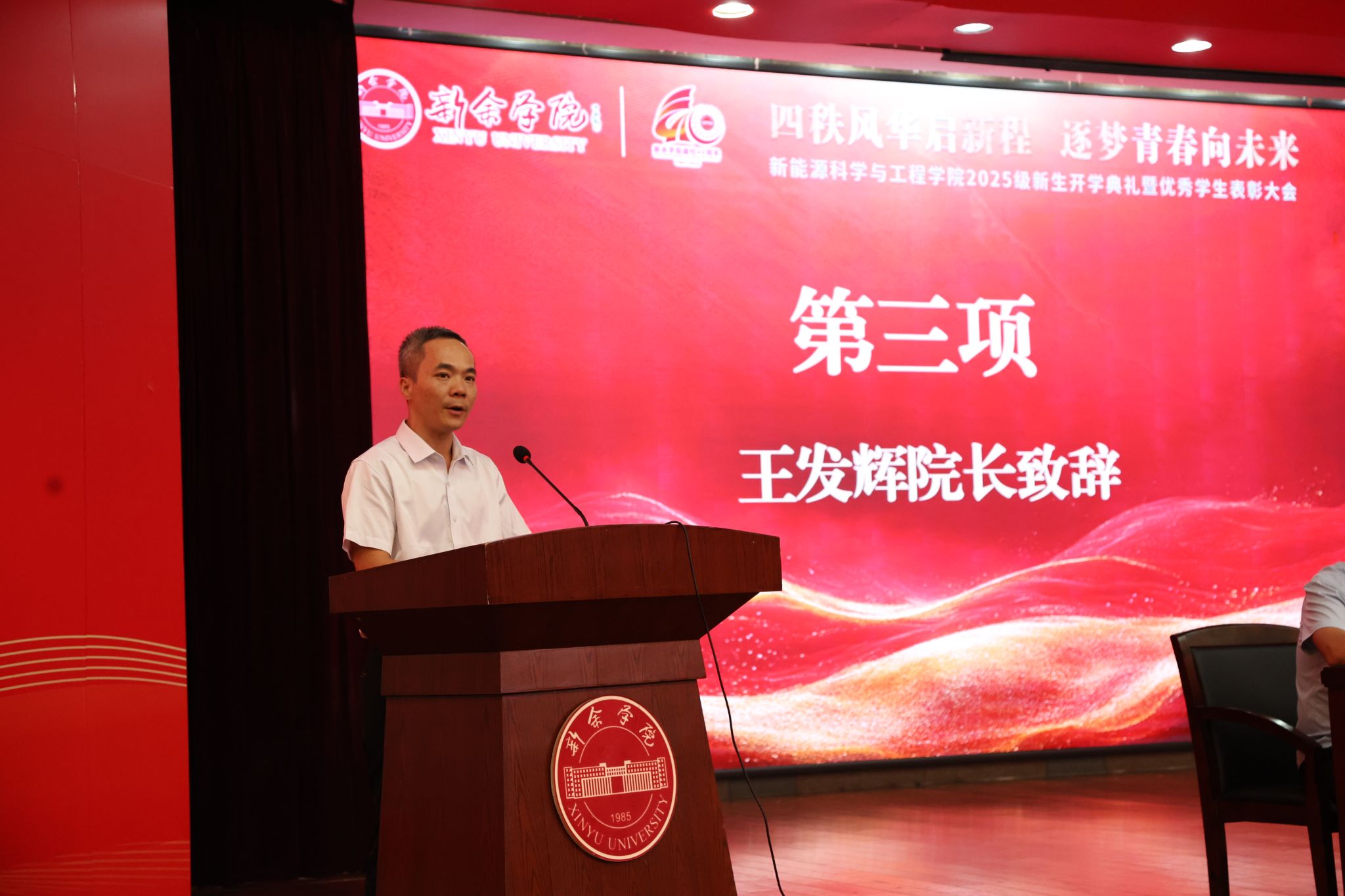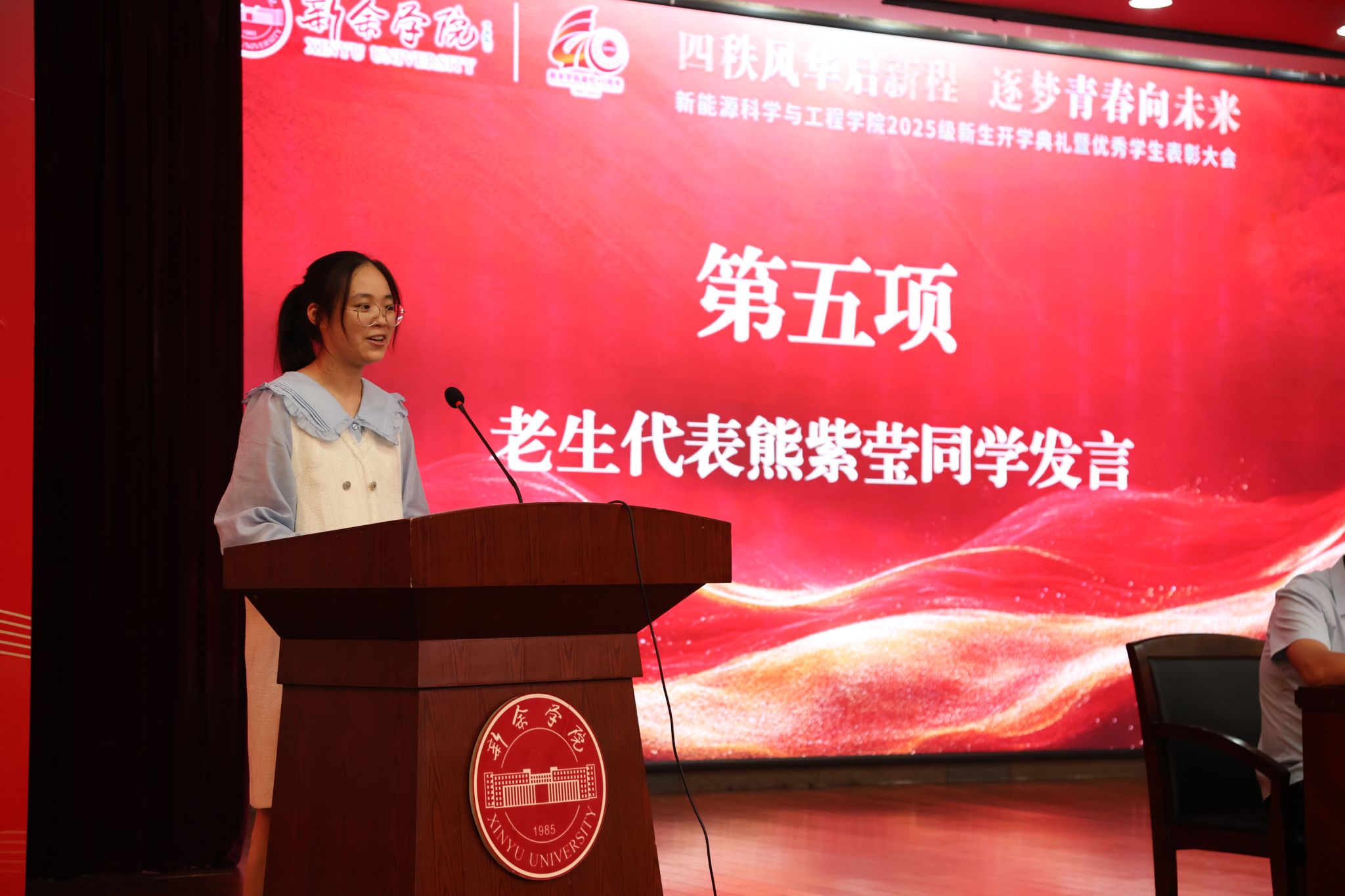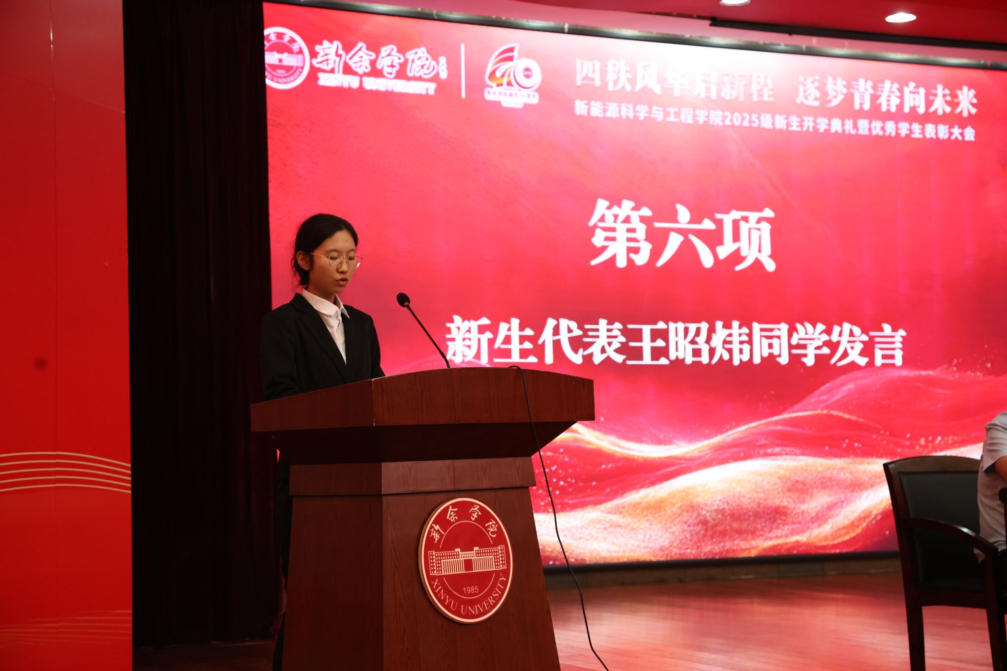 25材科班王昭炜同学作为新生代表发言,她表示,在大学我们需要学会主动规划学习方向、探索专业知识,积极参与课堂讨论,在思想碰撞中深化对知识的理解。她号召全体新生在新能源这片沃土上,以奋斗为笔、以汗水为墨,用青春与智慧书写属于我们的精彩篇章。