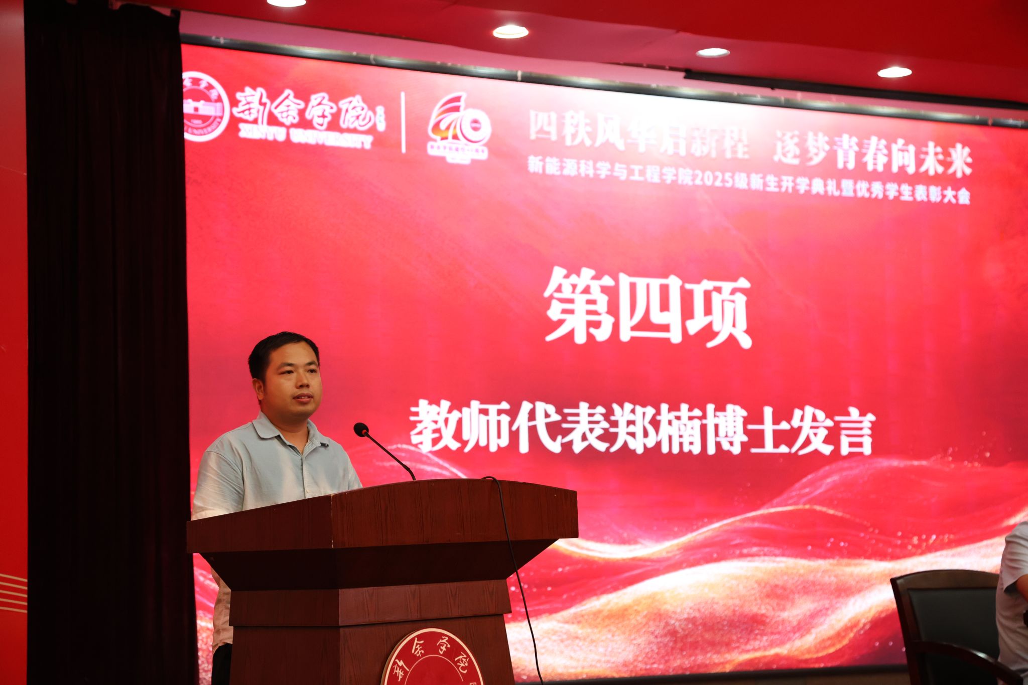 教师代表郑楠博士结合自身科研经历,寄语新生要夯实基础,跨界融合;要创新驱动,实践求真;要胸怀天下,绿色担当。希望同学们始终铭记“科技向善”的初心,将个人理想与国家“3060”双碳目标同频共振。