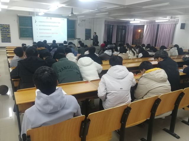 讲座围绕太阳能晶体硅技术现状及发展方向为主题,内容包括太阳能硅材料种类及简要生产流程、单晶硅生产方式、单晶硅市场及发展趋势等。结束后,何亮副经理针对同学们提出的本专业在光伏领域就业岗位、光伏企业地区分布、考研等问题做了详细回答。对此,同学们表示对今后的学习和就业有了更清晰的认知!