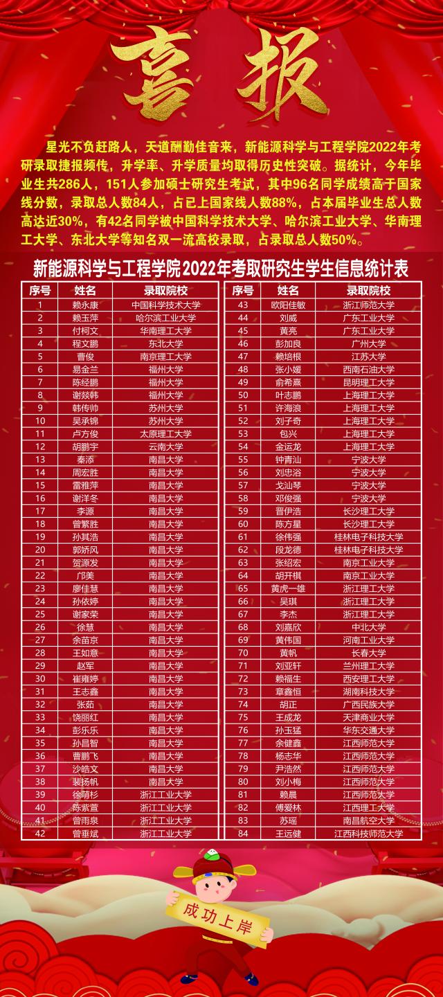 星光不负赶路人,天道酬勤佳音来,bevictor伟德2022年考研录取捷报频传,升学率、升学质量均取得历史性突破。据统计,今年公司毕业生共286人,151人参加硕士研究生考试,其中96名同学成绩高于国家线分数,录取总人数84人,占已上国家线人数88%,占本届毕业生总人数高达近30%,有42名同学被中国科学技术大学、哈尔滨工业大学、华南理工大学、东北大学等知名双一流高校录取,占录取总人数50%。