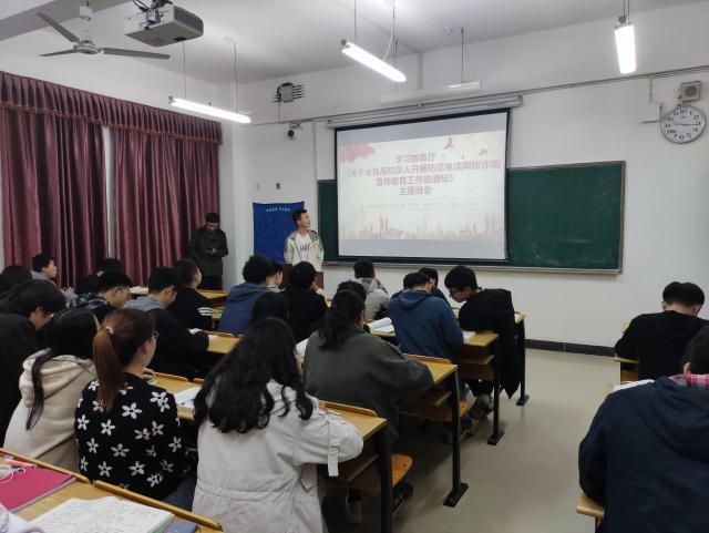 会上,班主任向同学们介绍了校园贷相关知识,分析了造成校园贷现象的原因,要求同学们提高防范意识,树立正确消费观,理性消费。二是各班传达学习了省教育厅《关于全省高校深入开展防范电信网络诈骗宣传教育工作的通知》文件精神,提醒同学们平时一定要注意防范电信诈骗,并加强和老师的沟通。同时还向同学们普及了“防溺水”安全知识,增强防范意识。最后,各班采取多种形式开展党史学习教育,如党史知识竞赛、观看红色电影主题班会、主题团课、红色经典朗诵等。