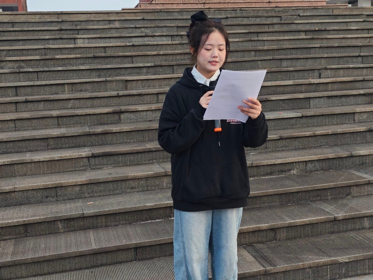 升旗礼毕,员工代表阮慧琳发言,她结合新时代青年担当,号召同学们要继承先辈遗志,将个人理想融入国家发展伟业,以真才实学践行青春誓言。