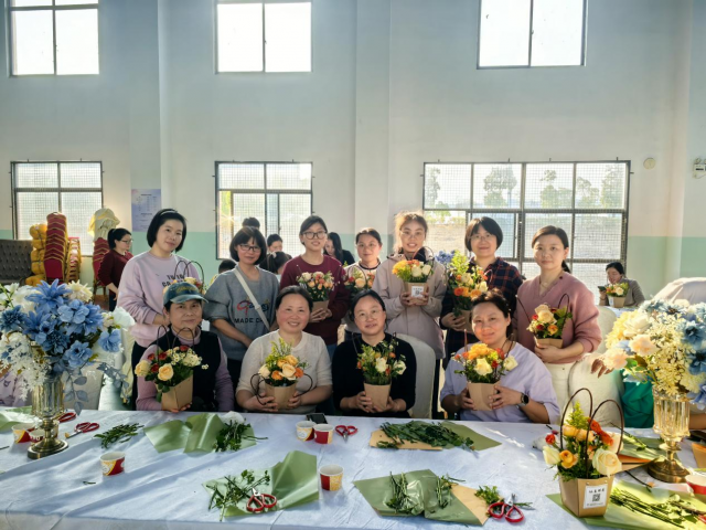 随后,专业花艺师为大家带来了一场精彩的花艺课。在老师的指导下,女教职工们将一朵朵鲜花精心搭配,创作出一篮篮独具匠心的插花作品。看着自己亲手制作的作品,大家脸上洋溢着幸福的笑容。