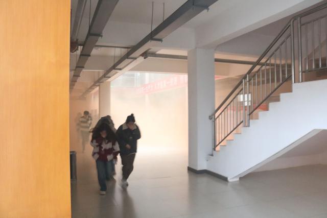 演练开始,一声哨响,听到报警声,看到烟雾弥散,员工在每层疏散组老师的引导下,捂住口鼻,低姿弓背,自行成队,迅速而有序地疏散到预定集结点。最后员工干部负责清点人数,向总指挥汇报人员疏散情况。