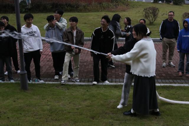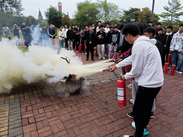 演练最后是消防器材实操阶段。王中明现场示范了如何正确使用灭火器扑灭火情,并指导公司师生使用灭火器扑灭油盆火和如何正确使用水带灭火。