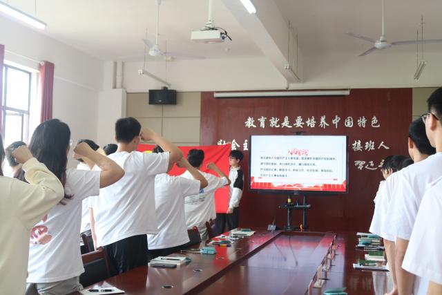 在主持人杨世平的带领下,全体团员面向团旗,高举右拳,庄严宣誓。团员们用铿锵有力的誓言,宣读出内心深处浓厚的爱国情义。